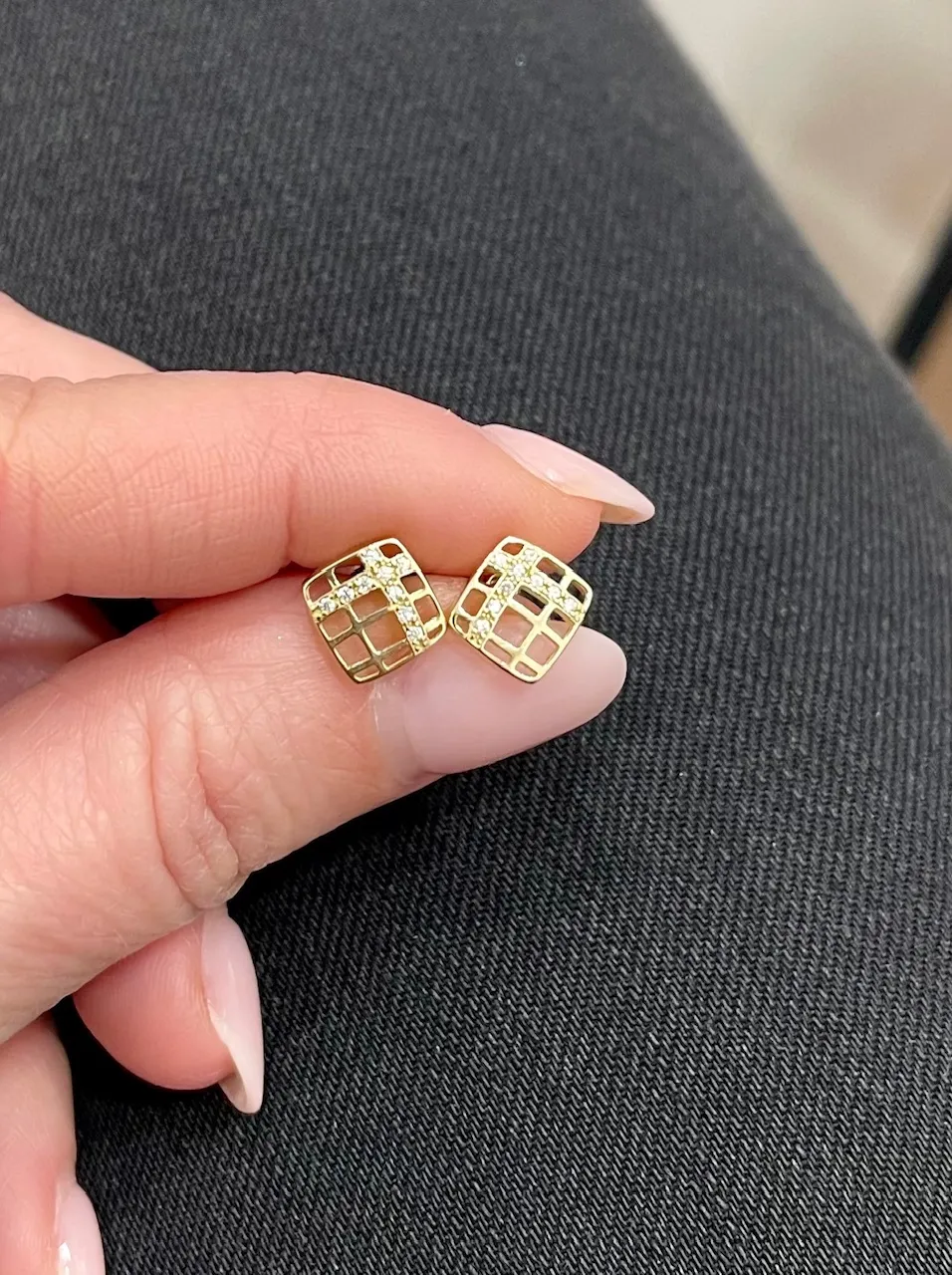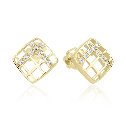 Krásne náušnice zo žltého 14k zlata vyrobené v modernom dizajne zdobené bielymi zirkónmi.