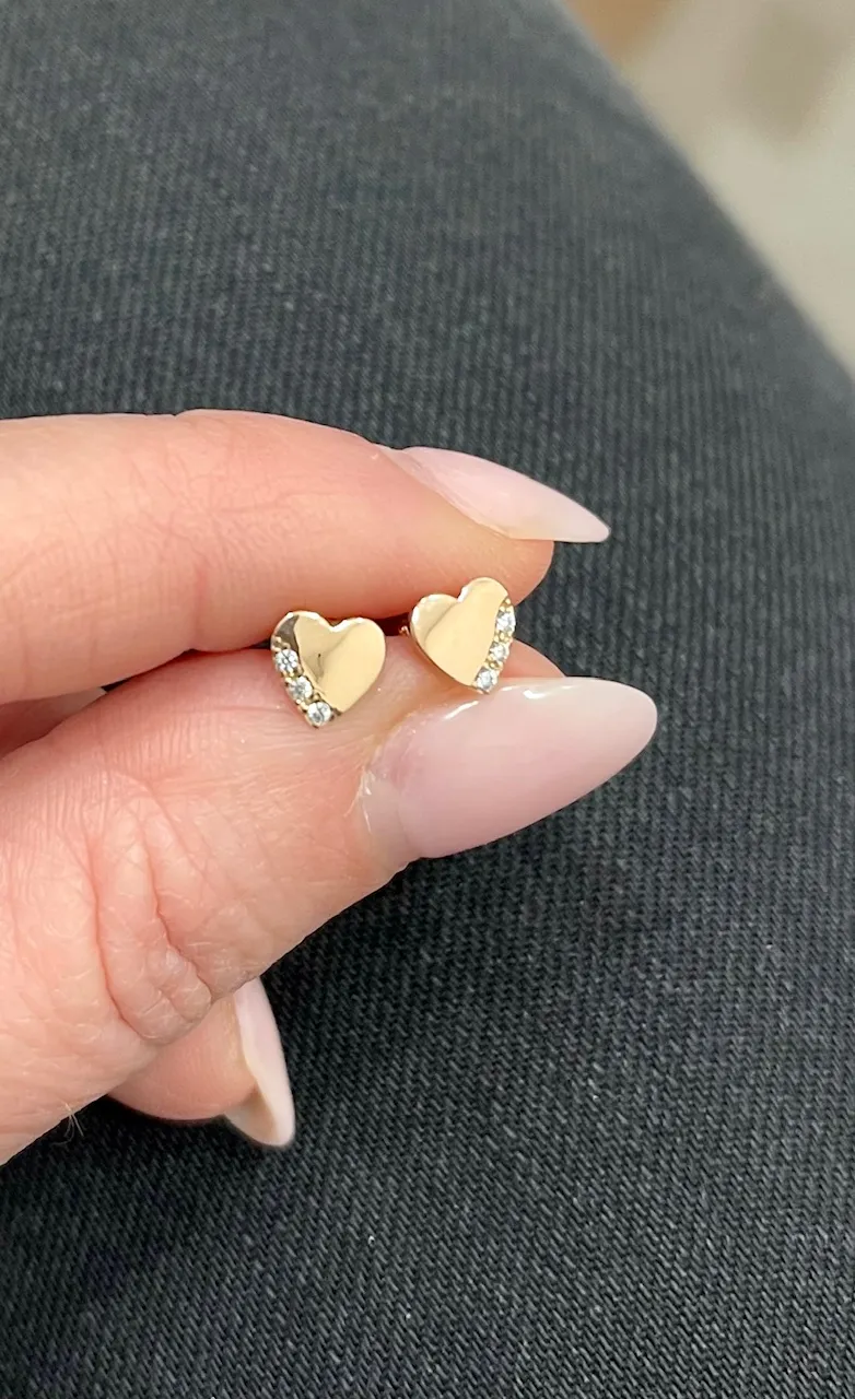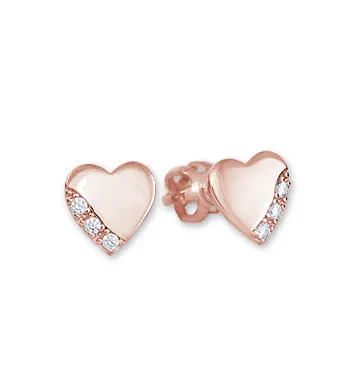 Krásne náušnice vyrobené v tvare srdiečok z ružového 14k zlata. Náušnice zdobia biele zirkóny.