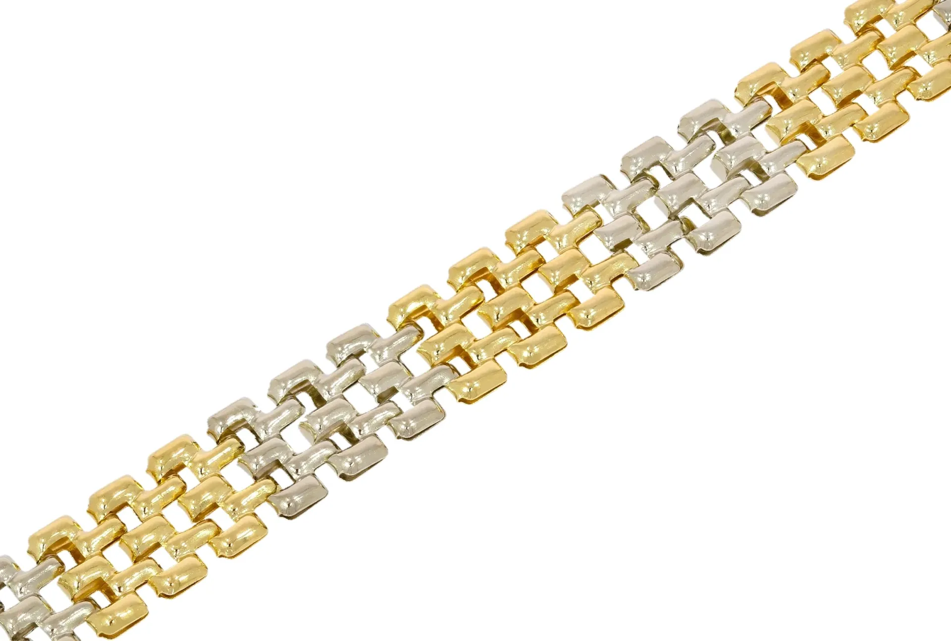 Exkluzívny elegantný zlatý náramok vyrobený kombináciou hladkých lesklých dielov zo žltého a bieleho zlata.