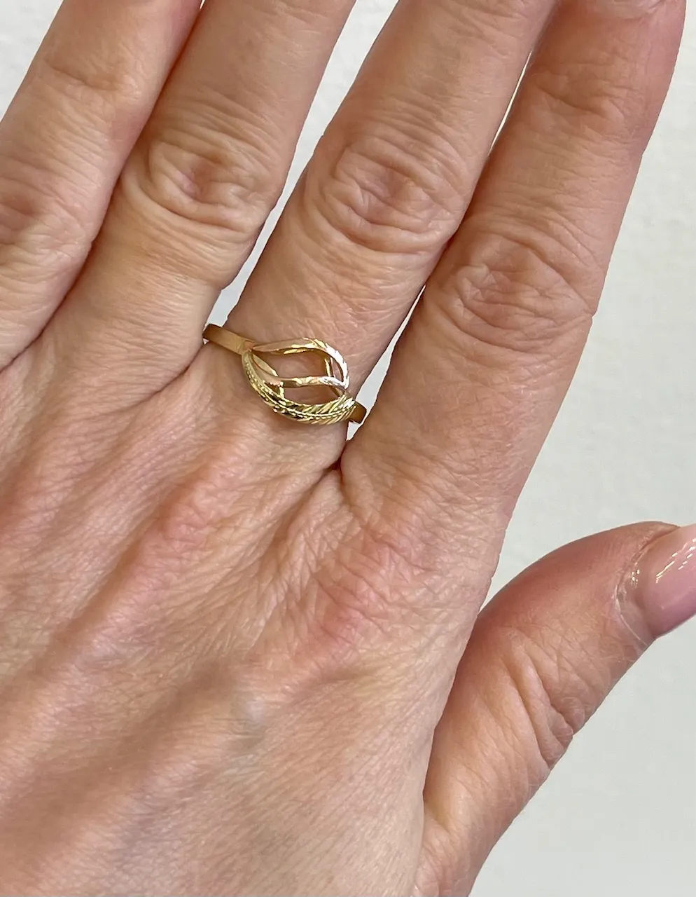 Nadčasový zlatý prsteň zdobia gravírované ornamenty zo žltého a červeného zlata.