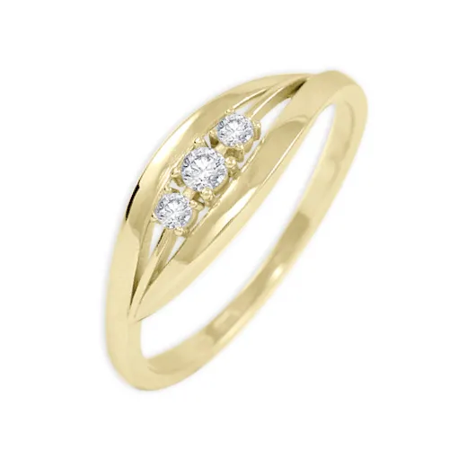 Hladké kontúry zlatého prsteňa zdobia uprostred tri biele zirkóny.