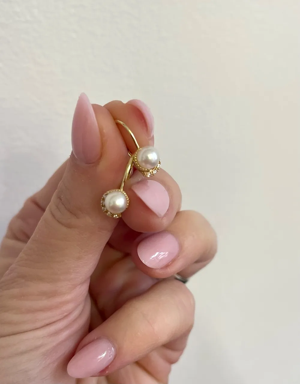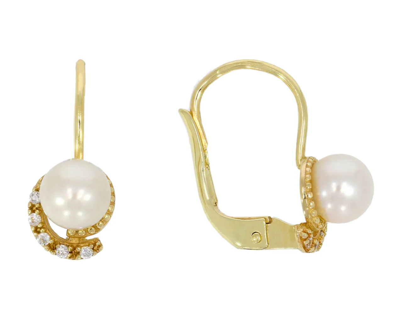 Elegantné zlaté náušnice zdobené riečnou perlou a bielymi zirkónmi. Náušnice majú klasické patentové zapínanie a sú vhodné aj ako darček.