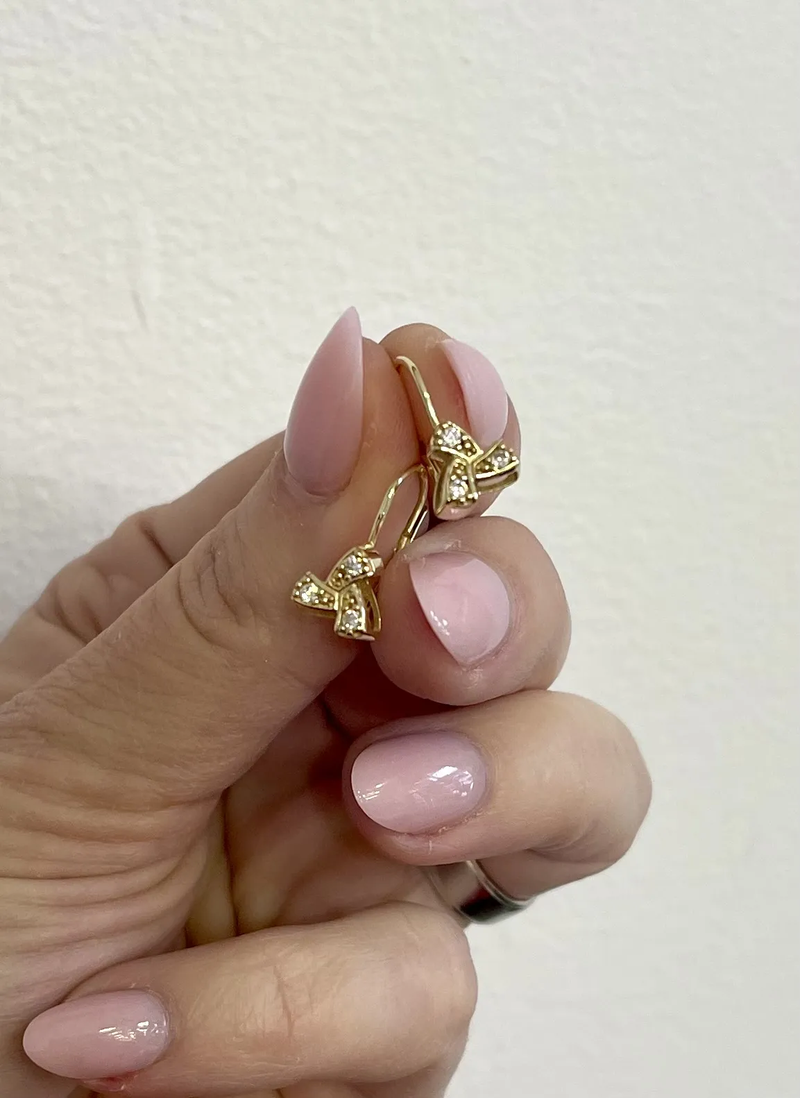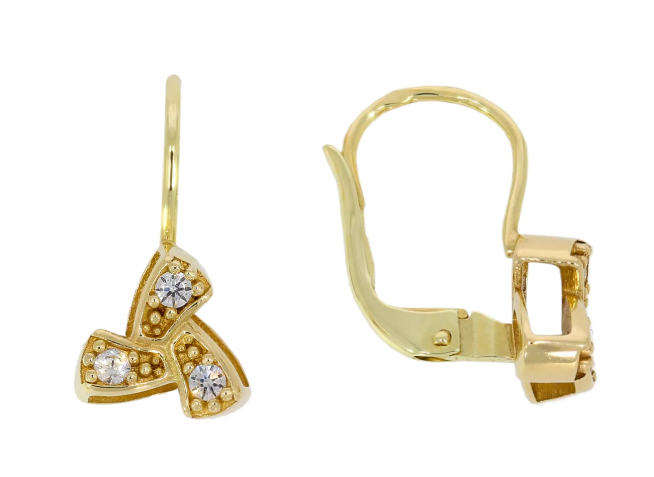 Krásne zlaté náušnice zdobené bielymi zirkónmi s obľúbeným patentovým zapínaním.