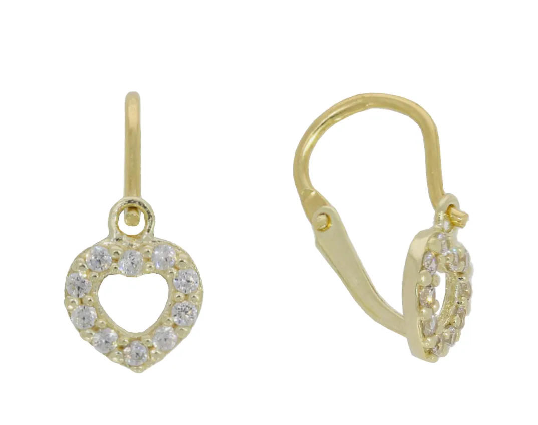 Roztomilé náušnice vyrobené zo žltého karátového zlata v tvare srdiečok zdobí množstvo bielych zirkónov. Náušnice sú v´daka bezpečnému zapínaniu spredu vhodné pre dievčatká už od narodenia.