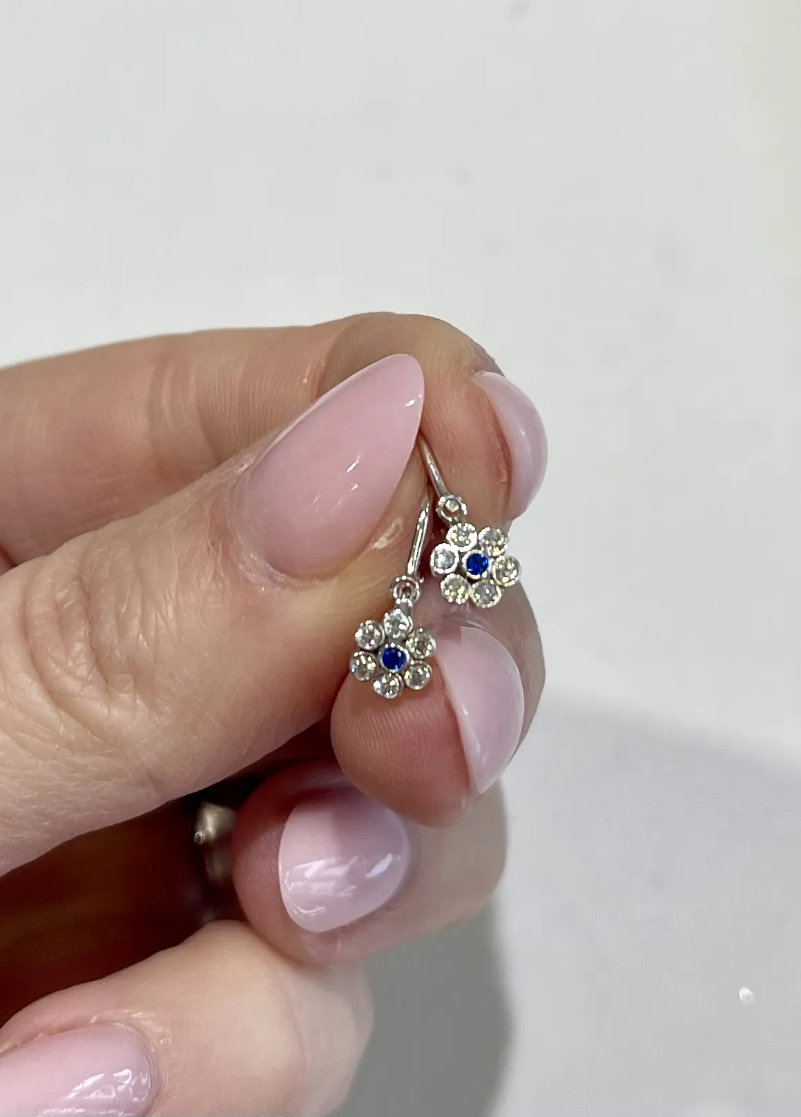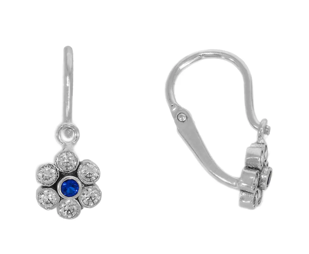 Krásne náušničky vyrobené z bieleho 14 karátového zlata v tvare kvetiniek zdobia biele a modré zirkóny. Náušnice majú bezpečné zapínanie spredu a sú vhodné aj ako darček na krstiny.