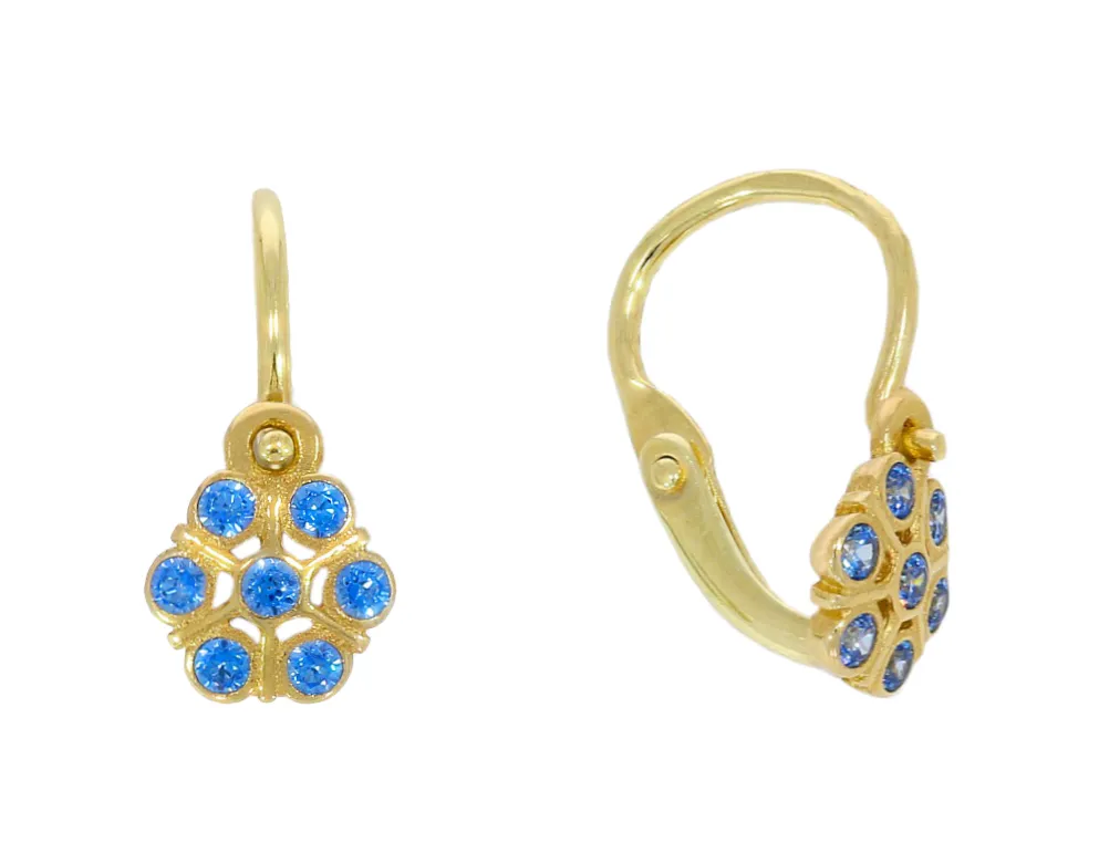 Zlaté náušnice vyrobené zo žltého 14 karátového zlata v tvare kvetiniek zdobia modré zirkóny. Náušnice majú bezpečné zapínanie spredu a sú vhodné aj ako darček nepríklad na krstiny.