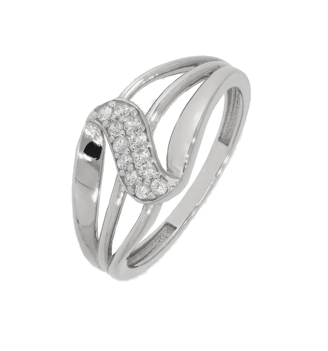 Krásny prsteň vyrobený z bieleho 14 karátového zlata zdobený bielymi zirkónmi.