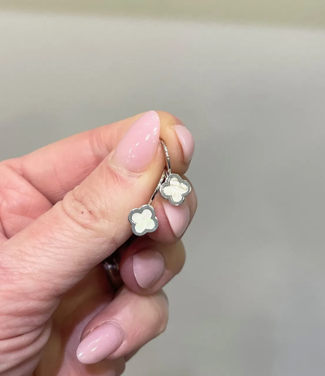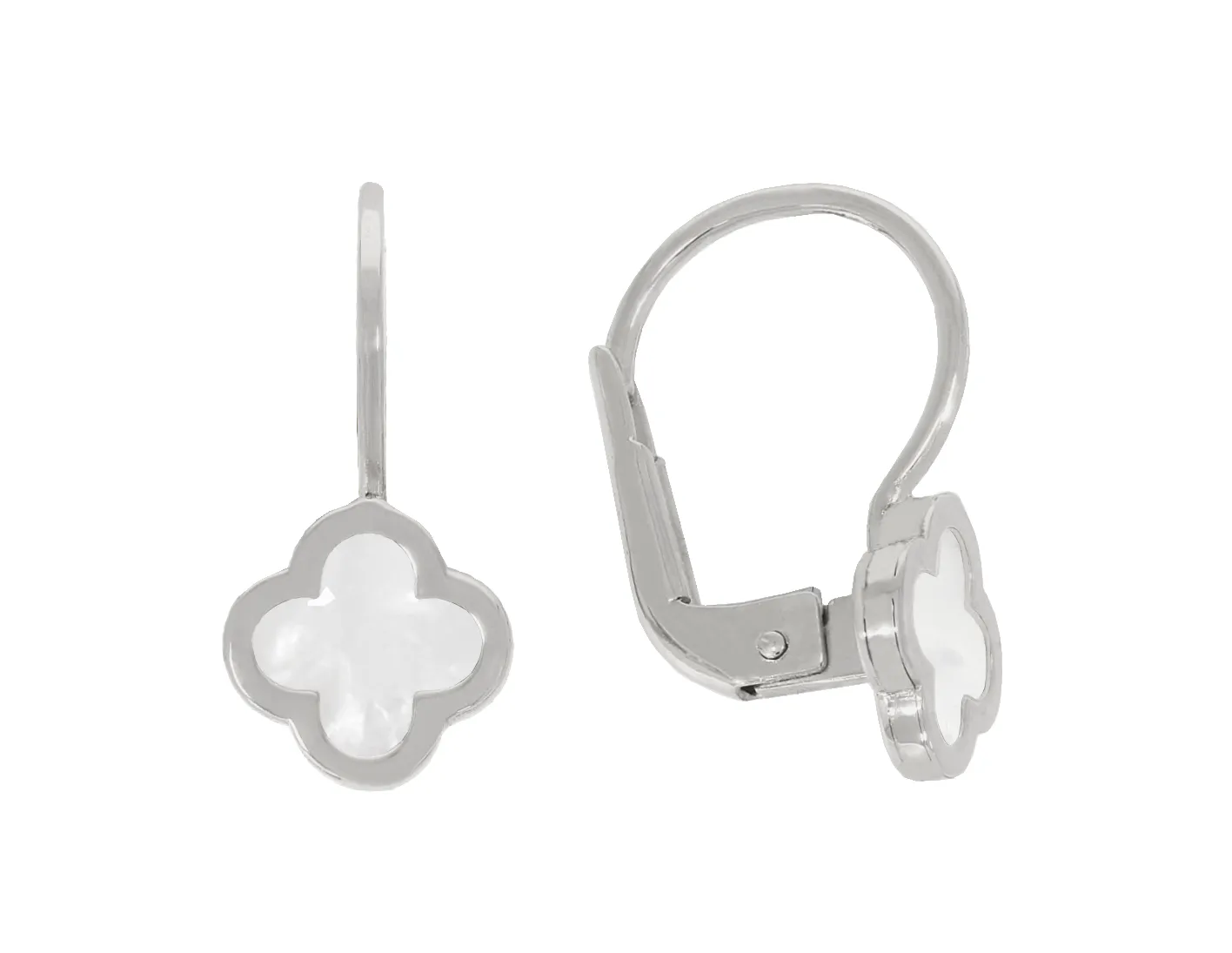 Krásne náušnice z bieleho 14 karátového zlata zdobené obľúbeným motívom štvorlístka s perleťovou výplňou. Náušnice majú obľúbené patentové zapínanie a sú vhodné aj ako darček.