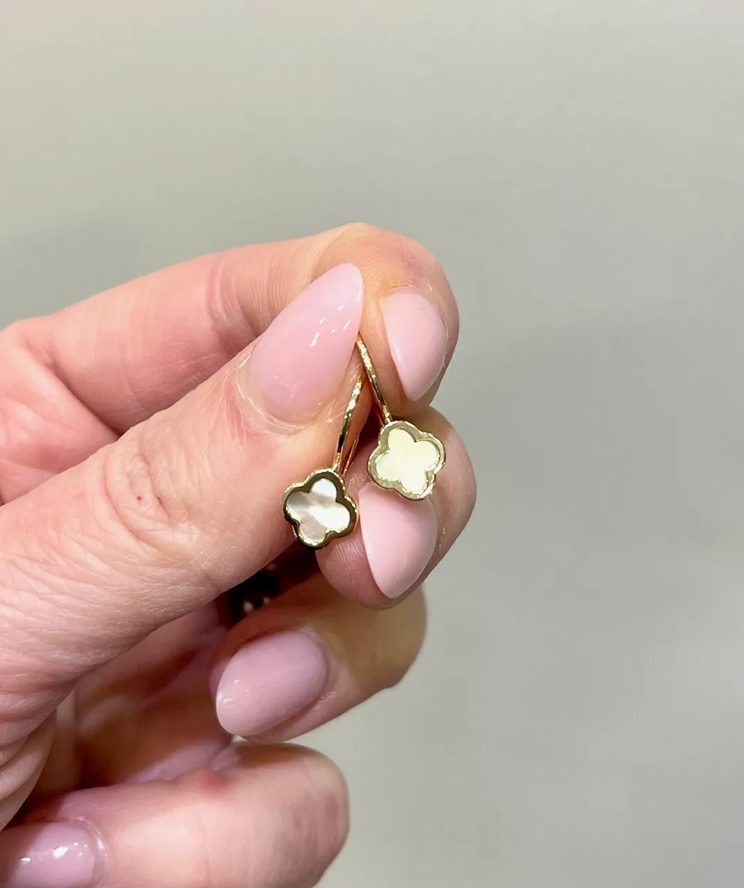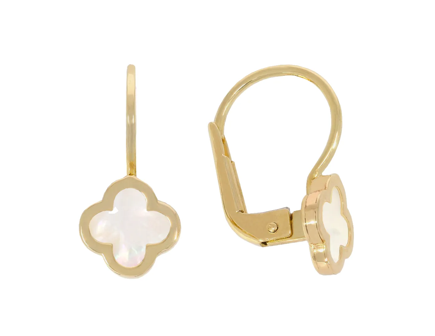 Krásne náušnice vyrobené zo žltého 14k zlata zdobené obľúbeným perleťovým štvorlístkom. Náušnice majú praktické patentové zapínanie a sú vhodné aj ako darček.