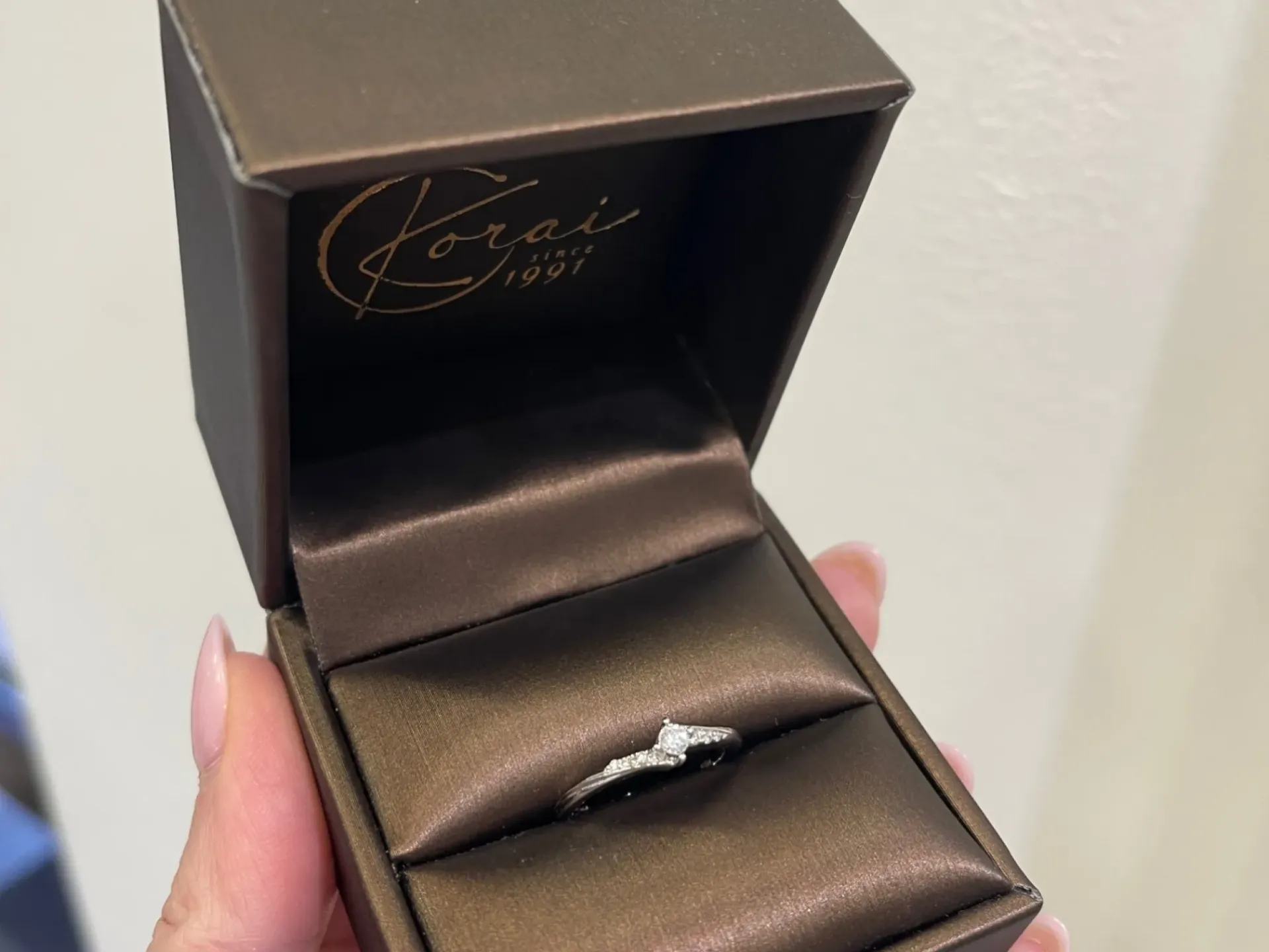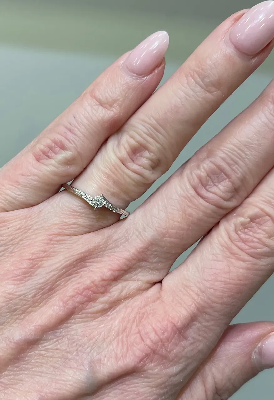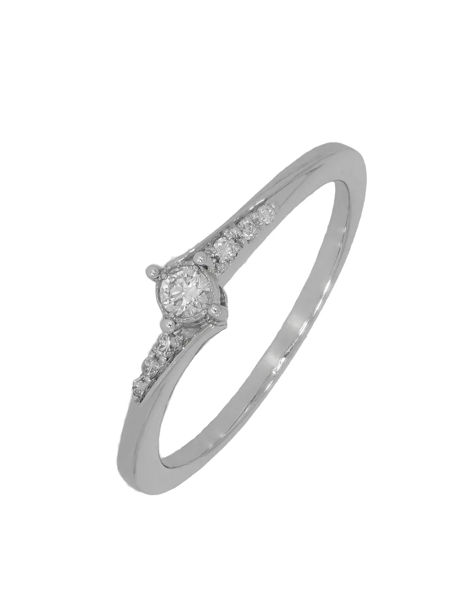 Krásny, nežný prsteň z bieleho 14 karátového zlata zdobený prírodnými diamantmi v celkovej váhe 0,08ct. K šperku patrí tiež certifikát potvrdzujúci pravosť diamantov.