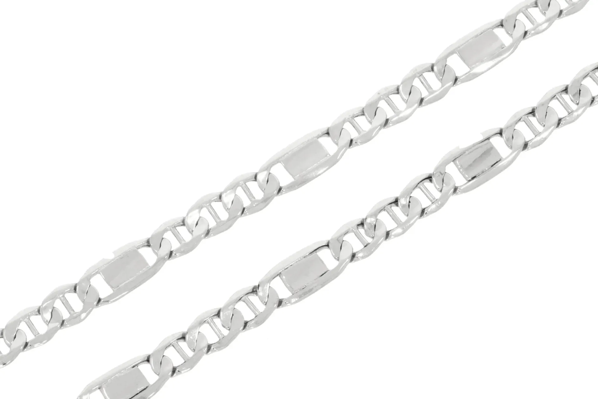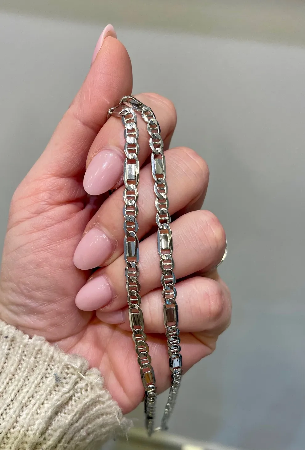 Veľmi pekná retiazka vyrobená z bieleho 14 karátového zlata a zapína sa na skákací krúžok. Retiazka je tvorená striedaním troch krátkych očiek ktoré sú uprostred spojené prúžkom zlata a jedného dlhého očka, ktoré je zdobené lesklou platničkou.